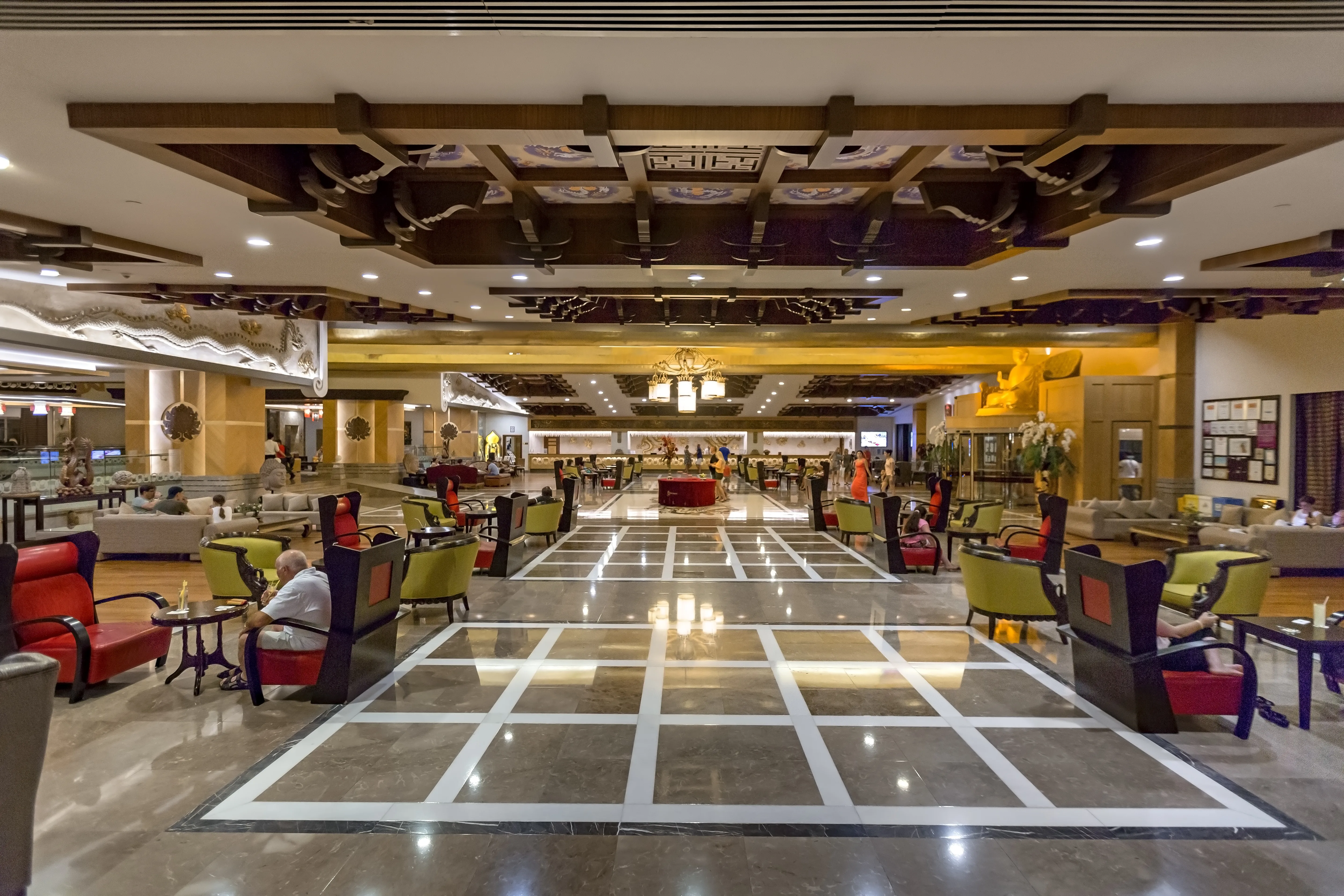 This extraordinary hotel has it all: its Chinese style architecture and interior design is simply impressive, on its beautifully landscaped premises it hosts a large pool area with water slides, an amusement park, an amphitheatre and a bowling alley. Various restaurants offer a large variety of delicious food. Last but not least, the hotel is directly situated on a golden sandy beach. Location:564 Total number of rooms; 6 Number of floors (main building); 408 Double rooms; 14 Junior suites; 3 Suites; 139 Family rooms; 5 Disability-friendly rooms Hotel type:hotel Methods of payment:MasterCard; Visa Distances (in meters):City centre (3000); Nearest Bus / Metro Stop (300); Airport (49700); Beach (10); Golf course (50000) Room facilities (Standard room):Bathroom; Disability-friendly bathroom; Shower; Bathtub; Hairdryer; Toiletries; Wi-fi; Direct dial telephone; TV; Satellite TV ; Radio; 220V power supply; Minibar; Tea and coffee making facilities ; Carpeted floors; Centrally regulated air conditioning; Safe; Balcony; Wheelchair-accessible; Smoking rooms; Smoke detector; Housekeeping; Extra beds on demand; Cot on demand Facilities:Wheelchair-accessible; Car park; 24-hour reception; Check-in hour; Check-out hour; Wi-fi; Room service (Extra Fee); Laundry service (Extra Fee); Medical service (Extra Fee); Babysitting service; 24-hour security; Bellboy service; Air conditioning in public areas; Smoke detector; Currency exchange facilities; Lift access; Shop; Garden; Terrace; Sun terrace; Gym; Luggage room; Clothes dryer; Private beach area Catering:Café; Bar; Restaurant; Non-smoking area; Highchairs; Poolside snack bar; Air conditioning in Restaurant Business:Conference room; Meeting room Entertainment:1 Indoor freshwater pool; 5 Outdoor freshwater pool; 1 Children’s swimming area; Sun loungers; Parasols; WaterSlides; Children playground; Kids’ club; Entertainment programme for adults; Entertainment programme for children; TV lounge; Theatre / auditorium; Game room; Nightclub Health:Sauna; Steam bath; Turkish bath (hamam); Massage (Extra Fee); Spa treatments (Extra Fee); Hairdressing salon (Extra Fee); Spa centre