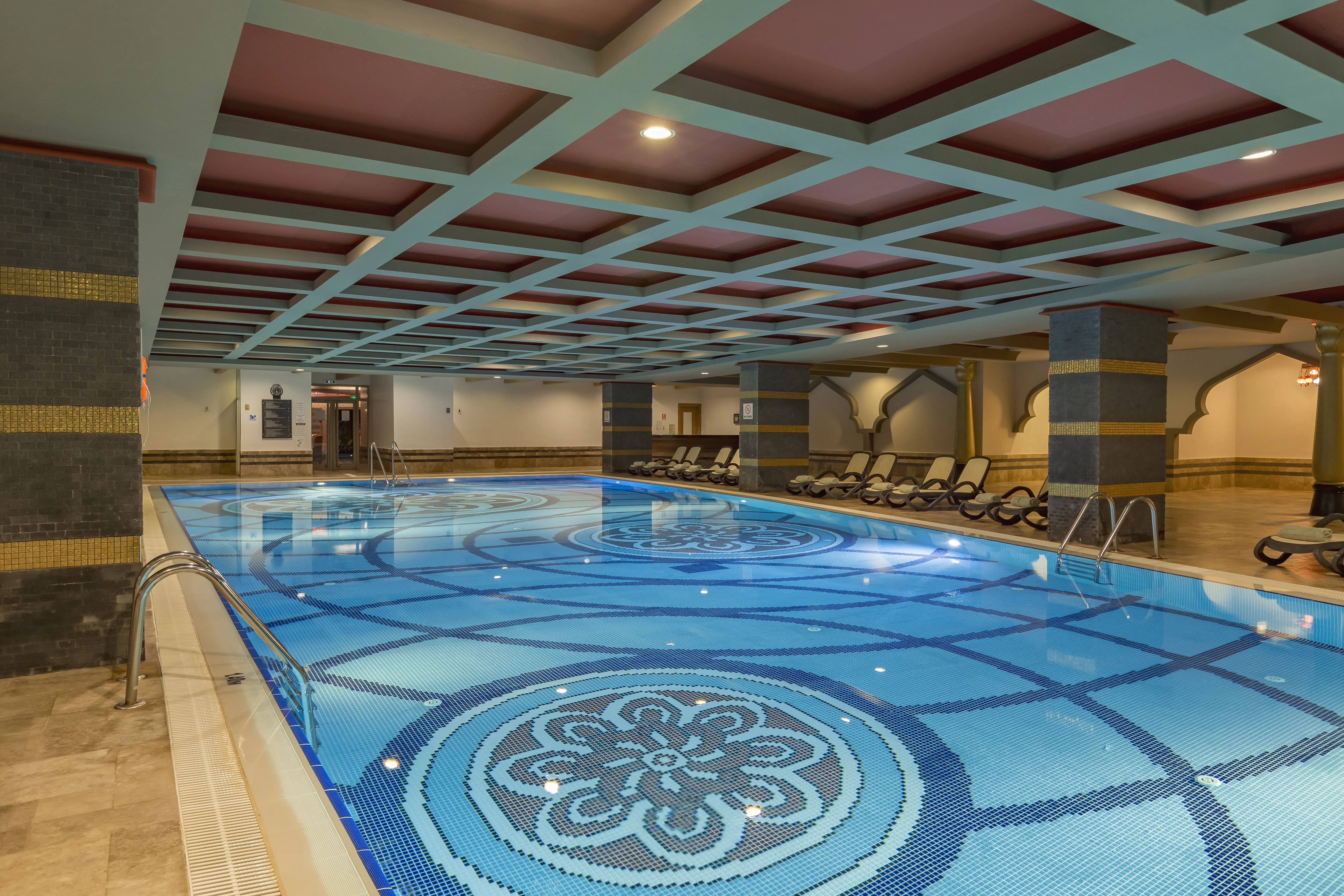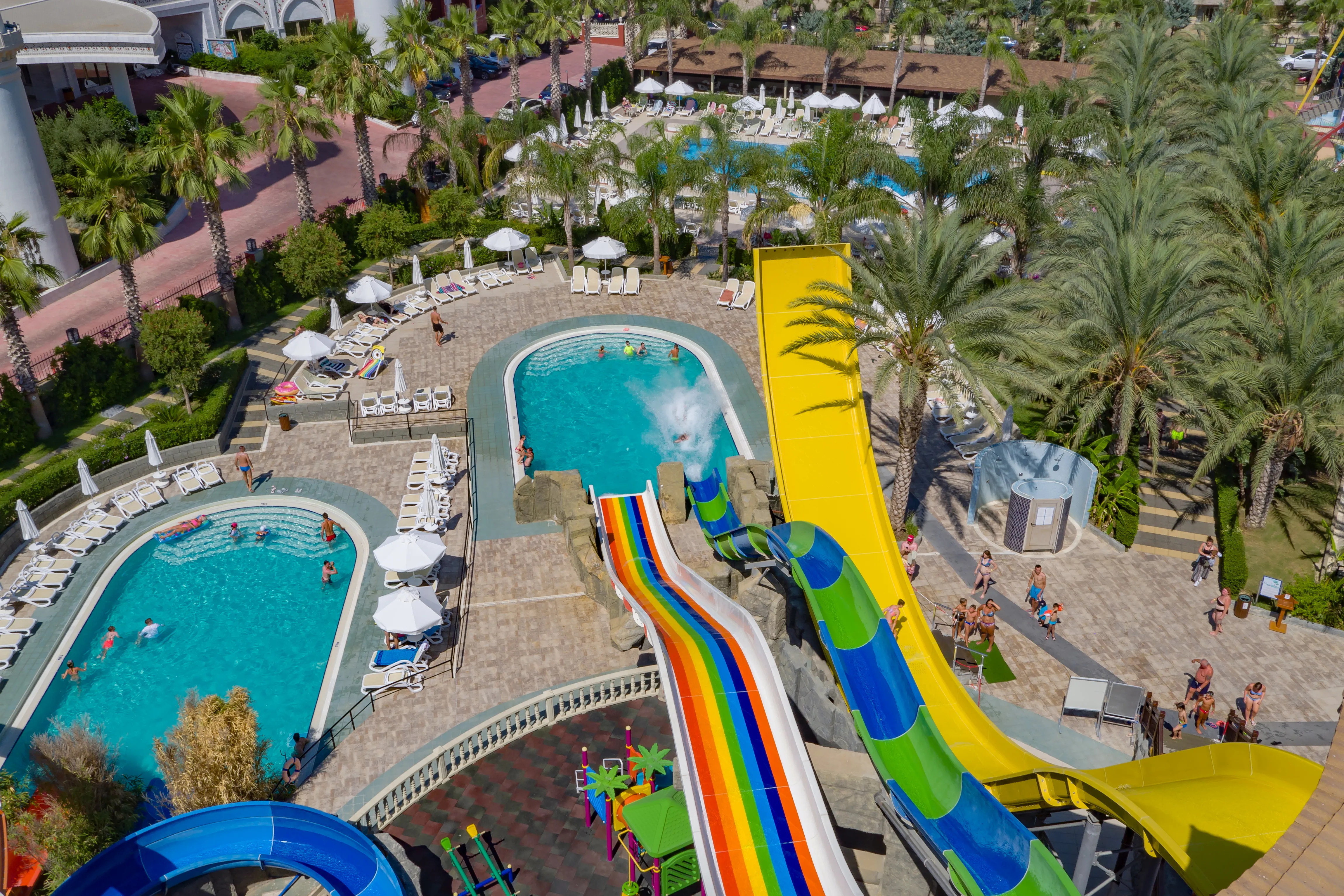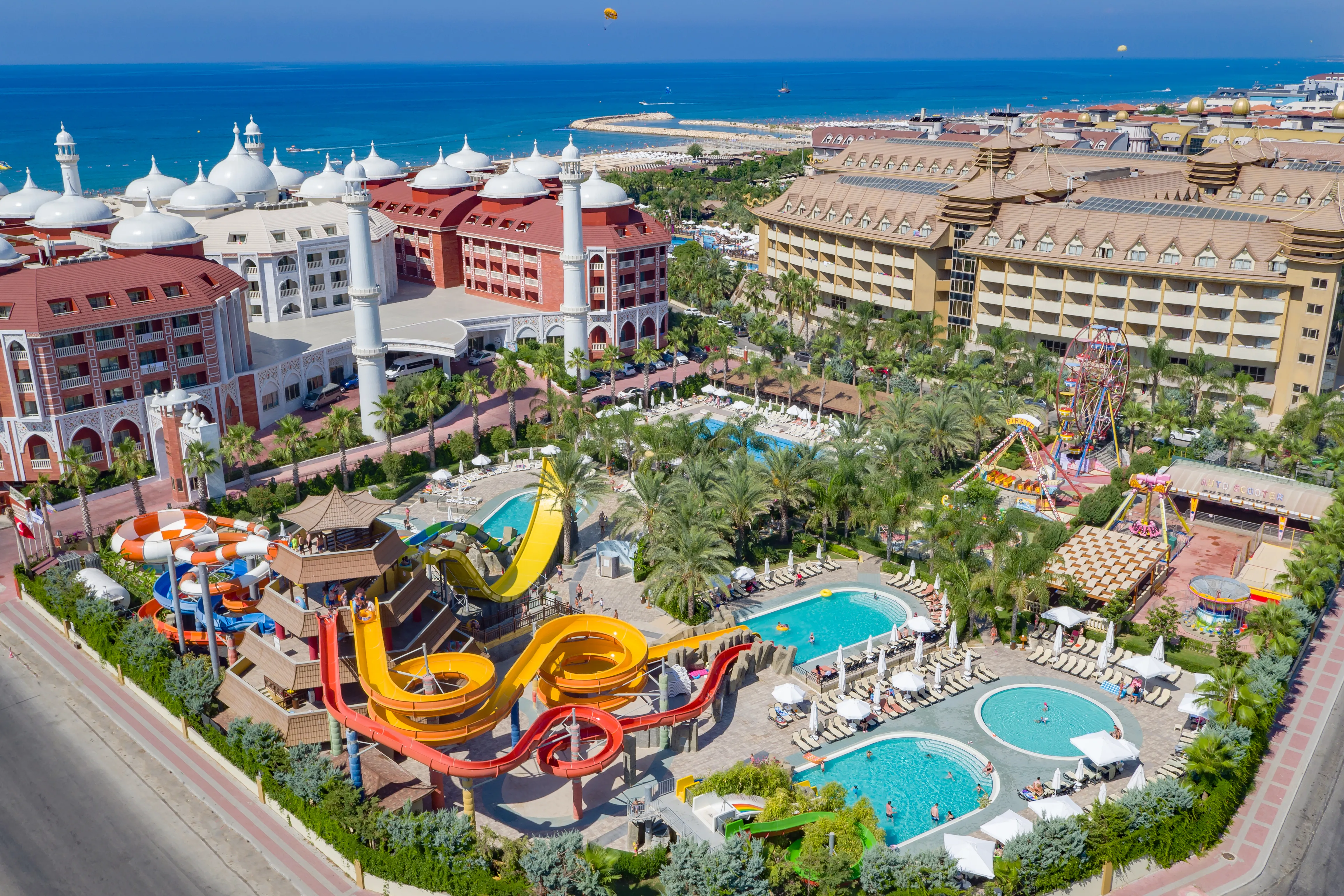 Breakfast buffet; Hot breakfast; Buffet lunch; Buffet dinner; À la carte dinner; All inclusive with alcoholic drinks own brands; Special dietary options; Snacks Things to keep in mind:Deposit on arrival; Identification card at arrival; Non-smoking establishment Sports:Aqua fit; Banana boating (Extra Fee); Waterskiing (Extra Fee); Jet ski (Extra Fee); Motor board ride (Extra Fee); Pedal boating (Extra Fee); Table tennis; Aerobics; Fitness; Beach volleyball; Billiards (Extra Fee); Bowling alley (Extra Fee); Tennis; Darts Healthy & Safety (COVID):Turkey - Safe Tourism Certificate