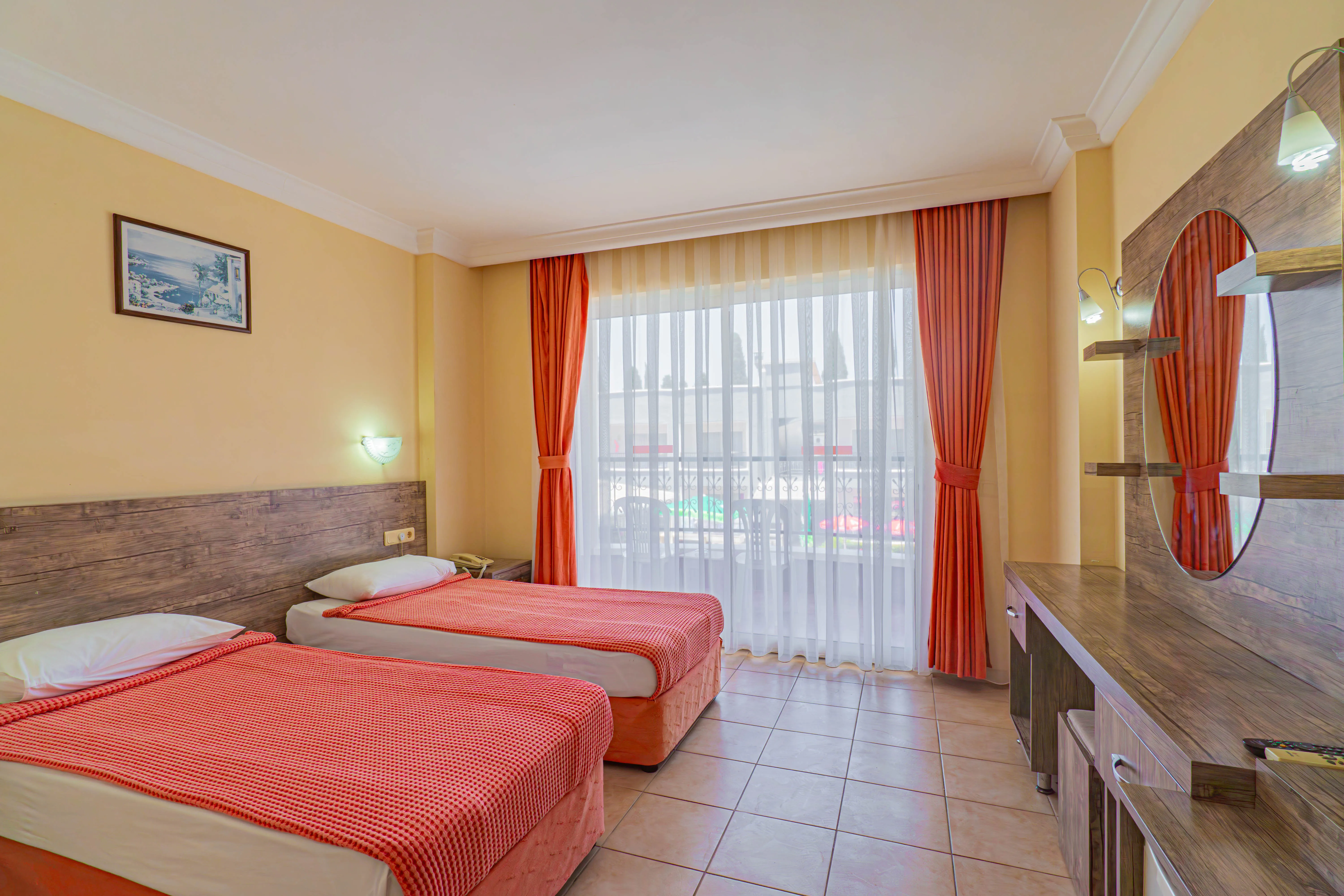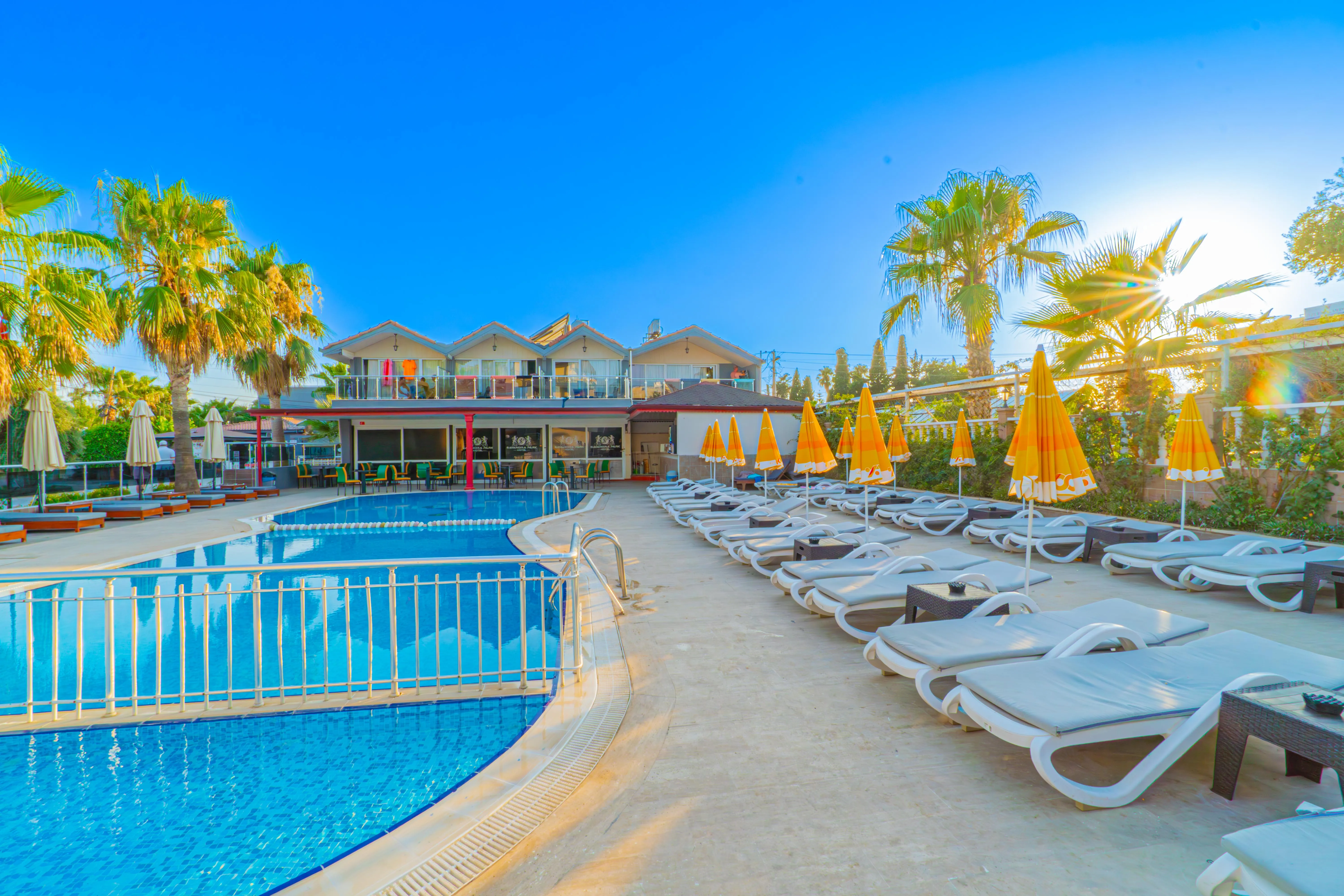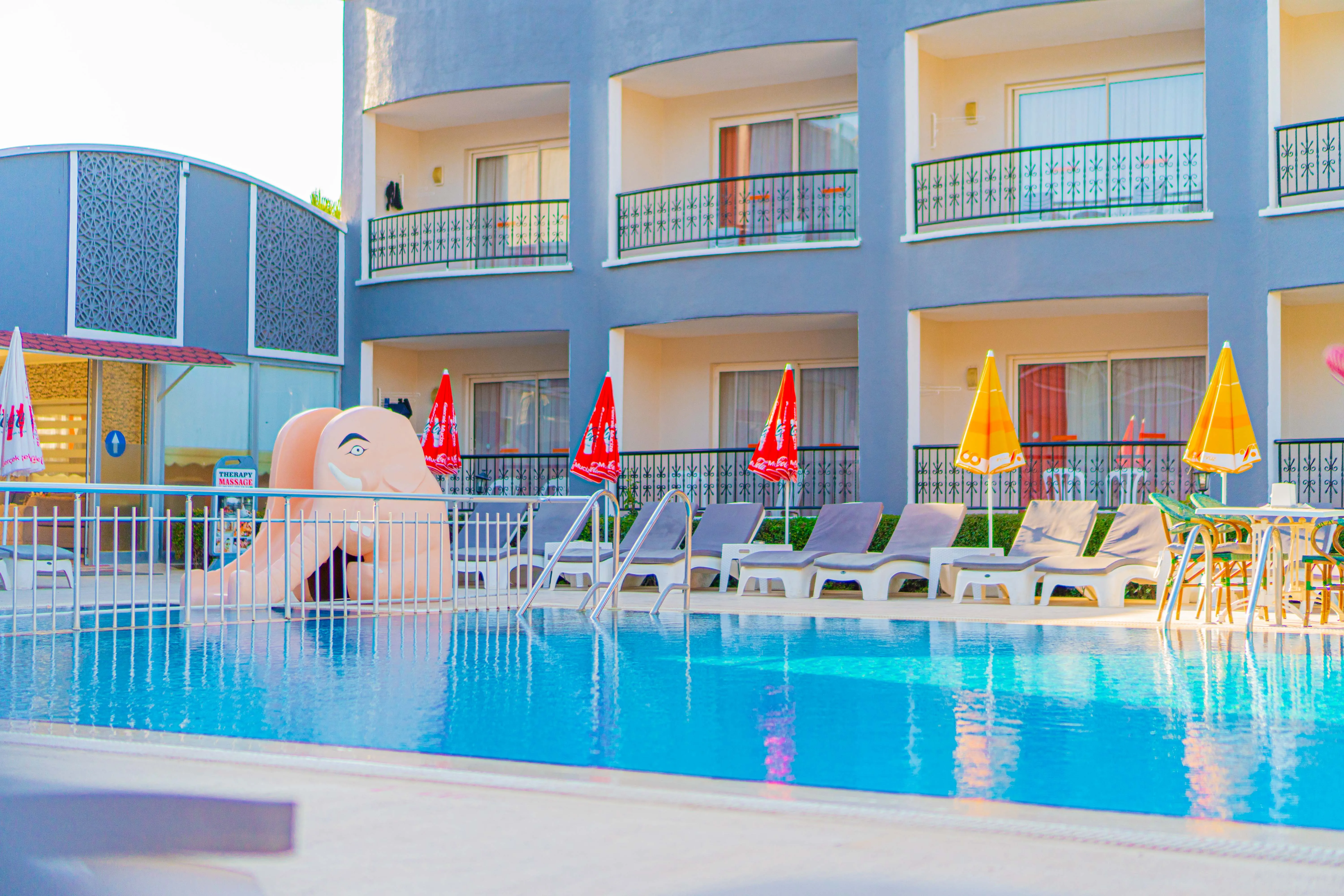 This hotel is perfectly situated to explore Antalya-Side, 800 m from Side city centre and 200 m from the beach. The airport is about 50 minutes away by car form the complex. With its convenient location, and public transportation links close to the hotel, it offers easy access to the city's must-see attractions. Manavgat Waterfall and the town of Manavgat are both a 20-minute drive away. There are several restaurants, cafés and bars in the surroundings, they are ideal for the ones who like to explore delicious flavours. Guests can rest and enjoy the sun by sunbathing on a sun lounger by the side of the outdoor swimming pool or diving in it for a refreshing swim. The rooms are decorated with warm colours to create a cosy atmosphere and make travellers feel welcomed and have unforgettable holidays. Location:2014 Year of most recent renovation; 102 Total number of rooms; 2 Number of floors (main building); 2 Number of floors (annexe); 87 Double rooms; 15 Bungalows; 16 Family rooms Hotel type:hotel Methods of payment:EC; MasterCard; Visa Distances (in meters):City centre (800); Bus/Train station (300); Nearest Bus / Metro Stop (300); Airport (65000); Harbour (800); Beach (150) Facilities:Wheelchair-accessible; Car park (Extra Fee); 24-hour reception; Check-in hour; Check-out hour; Late Check-out; Mobile phone coverage (Extra Fee); Wi-fi (Extra Fee); Local and international calls (Extra Fee); Car hire; Transfer service; Secure parking; Airport Shuttle (Extra Fee); Laundry service (Extra Fee); Launderette (Extra Fee); Medical service (Extra Fee); Day-care centre; Multilingual staff; 24-hour security; Bellboy service; Fireplace; Smoke detector; Hotel safe (Extra Fee); Currency exchange facilities; Cloakroom; Garden; Terrace; Partner’s bike shop/workshop; Sun terrace; Dining area; Private pool; Private beach area Catering:Bar; Restaurant; Show cooking; Air conditioning in Restaurant; Breakfast room Business:Printer; Fax Entertainment:2 Outdoor freshwater pool; Sun loungers; Parasols; Children playground; TV lounge; Pub Health:Turkish bath (hamam); Massage (Extra Fee)
