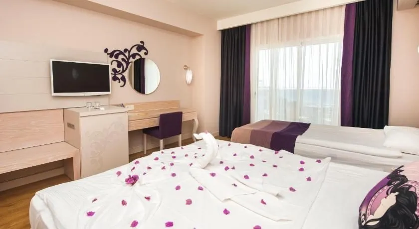 Set on a large complex of modern complex on Safak Beach in the Mediterranean Sea, this all-inclusive luxury resort is close to the D400 highway. Stylish rooms with balcony, sea views, wooden floors, flat-screen TV, free WIFI, minibar and coffee maker. Family rooms have interconnecting bedrooms, and some have a living room. Drinks are served at 6 bars, one of which is open 24/7, and meals are served in the restaurants free of charge. There is a spa, gym and indoor pool, as well as an outdoor swimming pool complex with sun loungers and 2 children havuzs pools with water slides. A children's club, a games room and an amphitheater are also available. Other facilities include beach access, tennis and water sports.