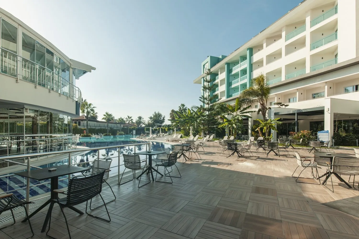 Descriere generala: 5 piscineRecomandat pentru familii cu copii Principalele puncte de atracție: 5 piscineRecomandat pentru familii cu copii Descriere hotel: Hotelul a fost inaugurat in anul 2013, se intinde pe o suprafata de 10.500 mp si este situat in Evrenseki/Side. Acesta are 283 camere in 3 cladiri diferite si un regim de masa Ultra All Inclusive. Facilități si dotari camere:  Hotelul are 283 camere impartite astfel:- 242 Standard Rooms- aceste camere au o suprafata de 32-34 mp si pot avea vedere Land, Side Sea View sau Sea View.- 23 Family Rooms- aceste camere au o suprafata de 47 mp si pot avea vedere Land, Side Sea View sau Sea View. Camerele family sunt formate din doua dormitoare, unul cu un pat dublu si unul single iar celalalt cu un pat single.- 15 Deluxe Rooms- aceste camere sunt cu vedere directa spre mare. Au o suprafata de 32-34 mp iar oaspetii cazati aici primesc la sosire un cos cu fructe si vin, produse cosmetice de lux si au dreptul la serviciul de turn down gratuit. Camerele sunt dotate cu pat matrimonial.Dotari camere: baie proprie cu dus, TV, telefon, minibar (alimentat zilnic cu apa, bauturi racoritoare si bere), conexiune internet, seif, aer condiționat, uscator de par, balcon. Sport și relaxare: piscine exterioare, piscine interioare, tobogane, baie turceasca, sauna, baie cu aburi, incapere cu sare, tenis de masa, darts, volei pe plaja, boccia, gimnastica in apa, stretching, jocuri la piscina, programe de animatie, mini club, coafor, sporturi nautice. Facilități pentru copii: - mini club pentru copiii cu varsta cuprinsa intre 4-12 ani si mini disco- loc de joaca - piscina pentru copii atat in aer liber cat si interioara, tobogane Facilități gratuite: bauturi alcoolice si non-alcoolice locale cat si o selectie de import, minibar alimentat zilnic cu apa, bauturi racoritoare si bere, seif in camera, o cina gratuita la unul din restaurantele a la carte, piscine exterioare, piscine interioare, tobogane, baie turceasca, sauna, tenis de masa, darts, volei pe plaja, boccia, gimnastica in apa, stretching, jocuri la piscina, programe de animatie, mini club Facilități contra cost: serviciul de masaj la centrul de spa, baie cu aburi, incapere cu sare, anumite bauturi de import si bauturi imbuteliate, room service, sporturi nautice, coafor, spalatorie/calcatorie, telefon, fax, servicii medicale Regim de masă: Ultra All inclusive - mic dejun, pranz si cina tip bufet- minibar alimentat zilnic cu apa, bauturi racoritoare si bere- bauturi alcoolice si non-alcoolice locale cat si o selectie de import incluse - gustari diverse intre mesele pricipale- o cina gratuita la unul din restaurantele a la carte Bine de stiut: Hotelul detine camere pentru persoane cu dizabilitati. Locatia: Hotelul este localizat la 9 km de statiunea Side, 12 km fata de orasul Manavgat si 58 km fata de aeroportul din Antalya. Soare si mare: Hotelul are o plaja proprie cu nisip cu o lungime de 55 m. Acesta detine si o piscina principala in aer liber cu o adancime de 140 cm, o piscina pentru copii, o piscina cu tobogane si piscine interioare pentru adulti si copii (deschise doar in extrasezon). Umbrelutele si sezlongurile sunt gratuite atat la piscina cat si la plaja. Restaurante si baruri: Restaurant principal, restaurante cu gustari si aperitive, 2 restaurante a la carte (o cina gratuita pe baza de rezervare in prealabil), Lobby bar, Pool bar, Beach Bar.