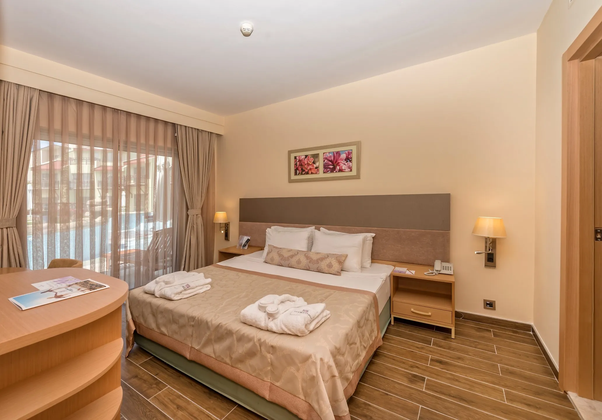 This hotel is located close to the sprawling, sandy beach of Kizilagac. Manavgat and the historical town and resort of Side are located just a short driving distance away. This hotel offers guests a great location from which to explore the rich culture and history of the area. The complex enjoys a charming design, beautifully combining elements of traditional and contemporary styles. The guest rooms are exquisitely designed, offering a cocoon of peace and serenity, in which to unwind at the end of the day. The rooms are well equipped with modern amenities. Guests are sure to be impressed by the extensive array of facilities and services that the hotel has to offer. Location:2017 Year of most recent renovation; 1030 Total number of rooms; 7 Number of floors (main building); 3 Number of floors (annexe); 23 Suites Hotel type:hotel Methods of payment:MasterCard; Visa Distances (in meters):City centre (12000); Beach (30) Room facilities (Standard room):Disability-friendly bathroom; Wi-fi; Wheelchair-accessible; Smoking rooms; Extra beds on demand Facilities:Wheelchair-accessible; Car park; 24-hour reception; Check-in hour; Check-out hour; Mobile phone coverage; Wired Internet (Extra Fee); Wi-fi; Car hire; Transfer service; Airport Shuttle; Room service; Laundry service (Extra Fee); Launderette; Medical service (Extra Fee); Babysitting service; 24-hour security; Bellboy service; Air conditioning in public areas; Smoke detector; Hotel safe; Currency exchange facilities; Cloakroom; Lift access; Newspaper stand; Shop; Garden; Terrace; Bicycle storage; Sun terrace; Gym; Luggage room; Clothes dryer; Private beach area; Electric kettle Catering:Café; Bar; 7 Restaurant; Non-smoking area; Highchairs; Poolside snack bar; Air conditioning in Restaurant Business:Conference room; Meeting room; Business centre Entertainment:1 Indoor freshwater pool; 14 Outdoor freshwater pool; 1 Children’s swimming area; Sun loungers; Parasols; WaterSlides; Children playground; Kids’ club; Entertainment programme for adults; Entertainment programme for children; Theatre / auditorium; Game room; Nightclub Health:Sauna (Extra Fee); Steam bath (Extra Fee); Hot tub; Turkish bath (hamam); Massage (Extra Fee); Spa treatments (Extra Fee); Hairdressing salon; Beauty salon; Spa centre
