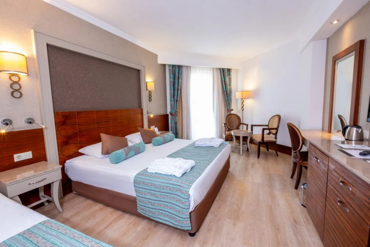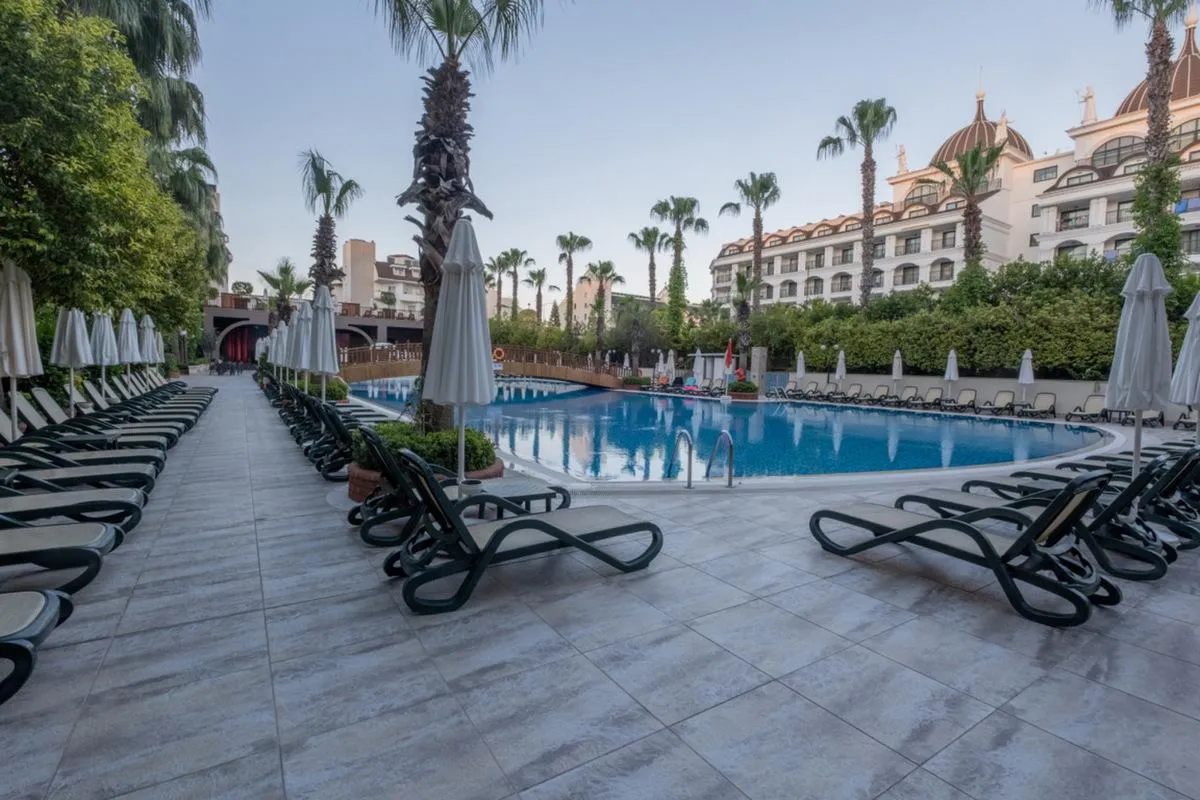 Descriere generală Hotelul Side Crown Palace este situat la cca. 500 m de o plajă privată cu nisip/pietriș. Orașul Manavgat este la aprox. 10 km (Side cca. 7 km). Locul de cazare are la dispoziție mașini de închiriat. De asemenea, aveți în apropiere o stație de taxi (cca. 50 m) cea ce vă garantează mobilitatea în timpul vacanțelor. Aeroportul (AYT) se află la aprox. 55 km. Un alt aeroport (GZP) este la cca. 113 km. Până la cea mai apropiată plajă există un serviciu de transfer (graduit). Facilități Resortul dispune de 4 etaje și peste 513 camere. Acesta oferă oaspeților săi recepție deschisă 24h (check-in de la 14:00, check out până la 12:00), lobby cu bar, aer condiționat, minimarket, alte magazine, discotecă și birou de schimb valutar. Pentru a satisface apetitul vă stau la dispoziție un snackbar. Accesul la internet WiFi este disponibil gratuit pentru oaspeții hotelului. Pentru evenimente de afaceri, hotelul oferă o zonă de conferințe. Serviciul de menaj este gratuit. Room service, spălătorie, călcat și serviciul medical sunt disponibile la un cost suplimentar. Piscină În grădinile modernului hotelul există o piscină precum și o piscină pentru copii și un tobogan de apă. La piscină sunt disponibile gratuit șezlonguri și umbrele de soare. Un bar lângă piscină oferă oaspeților băuturi răcoritoare. Catering Mic dejun (între orele 07:00 - 10:00) bufet suedez. All Inclusive: Mic dejun târziu (între orele 10:00 - 11:00), băuturi răcoritoare (10:00 - 00:00), cafea și ceai (10:00 - 00:00), prăjituri și produse de patiserie (11:30 - 18:00), aperitive (12:30 - 16:00), bere (10:00 - 00:00), vin (10:00 - 00:00) și băuturi alcoolice naționale (10:00 - 00:00). Sport/Leisure Este disponibil: Biliard (posibil contra cost), volei, tenis de masă (posibil contra cost), fitness, aerobic, darts (posibil contra cost) și volei pe plajă. Pe plajă puteți practica sporturi nautice precum jet ski (unele de către furnizori locali). Există serviciu de închiriere de biciclete. Oferte de wellness: Zonă de spa și masaje contra cost. Saună și hamam posibil contra cost. Divertisment pentru adulți: spectacole de seară. Copiii vor găsi un loc de joacă în exteriorul hotelului. Îngrijirea copiilor: program de animație pentru copii, mini club pentru copii (de la 4 - 12 ani) și babysitting (contra cost). Sală de jocuri. Informații suplimentare Pentru anumite facilități sau activități se pot aplica taxe suplimentare. Unele servicii depind de anotimp și de condițiile climatice locale. Limbi de serviciu: engleză, germană și turcă. Carduri de credit: Visa și Euro/MasterCard. Standard Familienzimmer: Dotate cu parchet laminat, încălzire controlată centralizat, ceainic (gratuit), minibar (posibil contra cost), balcon, acces la internet (gratuit), seif (contra cost) și TV prin satelit precum și aer condiționat controlat central. Standard Familienzimmer (Poolblick): Cameră cu parchet laminat, încălzire controlată centralizat, ceainic (gratuit), minibar (posibil contra cost), acces la internet (gratuit), seif (contra cost) și TV prin satelit precum și aer condiționat controlat central. Doppel Deluxe Zimmer (Poolblick): Cameră cu parchet laminat, încălzire controlată centralizat, ceainic (gratuit), minibar (posibil contra cost), balcon, acces la internet (gratuit), seif (contra cost) și TV prin satelit precum și aer condiționat controlat central. Einzel Deluxe Zimmer (Poolblick): Dotate cu parchet laminat, încălzire controlată centralizat, ceainic (gratuit), minibar (posibil contra cost), balcon, acces la internet (gratuit), seif (contra cost) și TV prin satelit precum și aer condiționat controlat central. Doppel Standard Zimmer: Cameră cu parchet laminat, încălzire controlată centralizat, ceainic (gratuit), minibar (posibil contra cost), balcon, acces la internet (gratuit), seif (contra cost) și TV prin satelit precum și aer condiționat controlat central. Dimensiune: 28 m². Doppel Standard Zimmer (Economy): Cameră cu parchet laminat, încălzire controlată centralizat, ceainic (gratuit), minibar (posibil contra cost), acces la internet (gratuit), seif (contra cost) și TV prin satelit precum și aer condiționat controlat central. Doppel Standard Zimmer (Poolblick): Dotate cu parchet laminat, încălzire controlată centralizat, ceainic (gratuit), minibar (posibil contra cost), acces la internet (gratuit), seif (contra cost) și TV prin satelit precum și aer condiționat controlat central. Einzelbelegung Standard Zimmer: Dotate cu parchet laminat, încălzire controlată centralizat, ceainic (gratuit), minibar (posibil contra cost), balcon, acces la internet (gratuit), seif (contra cost) și TV prin satelit precum și aer condiționat controlat central. Einzelbelegung Standard Zimmer (Poolblick): Dotate cu parchet laminat, încălzire controlată centralizat, ceainic (gratuit), minibar (posibil contra cost), acces la internet (gratuit), seif (contra cost) și TV prin satelit precum și aer condiționat controlat central.