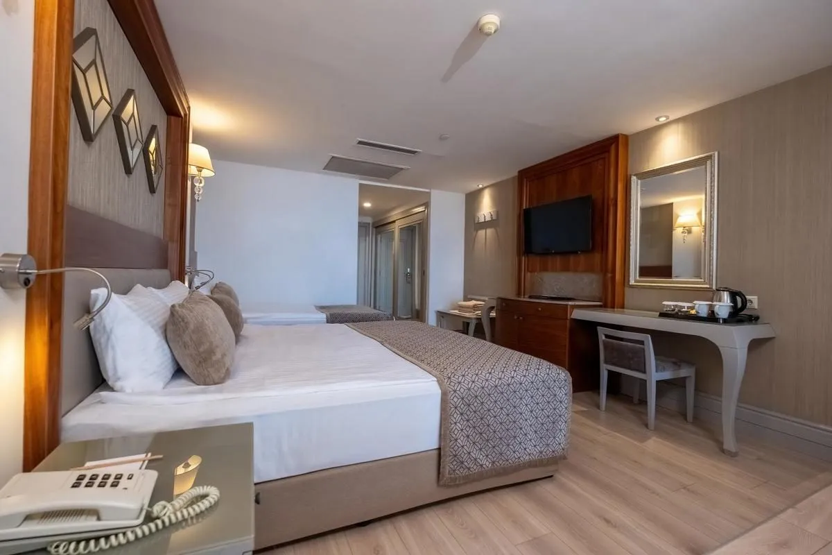 Descriere generală Hotelul Side Star Resort este locat la cca. 100 m de o plajă privată cu nisip. Pe plajă sunt disponibile gratuit șezlonguri și umbrele de soare. Orașul Side este la aprox. 12 km (Manavgat cca. 12 km, Antalya cca. 65 km). Următoarele atracții pot fi accesate de la hotel: Aspendos (cca. 20 km). Hotelul dispune de serviciu de rentacar. Aeroportul (AYT) se află la aprox. 50 km. Un alt aeroport (GZP) este la cca. 119 km. Facilități Resortul dispune de 5 etaje și peste 462 camere repartizate între o clădire principală și de 4 clădiri secundare. Acesta oferă oaspeților săi recepție deschisă 24h (check-in de la 14:00, check out până la 12:00), lobby cu bar, un total de 8 lifturi, aer condiționat, magazin, discotecă și parcare (gratuită). Accesul la internet WiFi este disponibil gratuit pentru oaspeții hotelului. Pentru evenimente de afaceri, hotelul oferă o zonă de conferințe. Serviciul de menaj este gratuit. Room service, spălătorie, călcat și serviciul medical sunt disponibile la un cost suplimentar. Piscină În grădinile acestui hotelul există o piscină precum și o piscină pentru copii și un tobogan de apă. Acolo sunt disponibile gratuit șezlonguri și umbrele de soare. La barul piscinei va puteți bucura de o băutura răcoritoare. Catering Mic dejun (între orele 07:00 - 10:00) bufet suedez. All Inclusive: micul dejun, prânzul și cina. Micul dejun, prânzul și cina pot fi servite numai în anumite restaurante. Apă. Mic dejun târziu (între orele 10:00 - 11:00), băuturi răcoritoare (10:00 - 00:00), cafea și ceai (10:00 - 00:00), prăjituri și produse de patiserie (16:00 - 17:00), bere (10:00 - 00:00), vin (10:00 - 00:00), băuturi alcoolice naționale (10:00 - 00:00), gustări la miezul nopții (21:30 - 07:00), internet gratuit, minibar gratuit în cameră (limitat) și utilizarea gratuită a seifului (în baza unei garanții). Sport/Leisure Oferte pentru sport și divertisment: Tenis de masă (gratuit), tenis (posibil contra cost), darts (gratuit), biliard (contra cost), volei pe plajă, aerobic, fitness, baschet și minigolf. Pe plajă puteți practica sporturi nautice precum jet ski (unele de către furnizori locali). Oferte de wellness: Saună și hamam gratuite. Zonă de spa și masaje contra cost. Divertisment pentru adulți: spectacole de seară. Pentru distracția celor mici există un loc de joacă. Îngrijirea copiilor: mini club pentru copii (de la 4 - 11 ani) și babysitting (contra cost). Sală de jocuri. Informații suplimentare Pentru anumite facilități sau activități se pot aplica taxe suplimentare. Unele servicii depind de anotimp și de condițiile climatice locale. Limbi de serviciu: engleză, germană, rusă și turcă. Carduri de credit: Euro/MasterCard și Visa. 2 Schlafzimmer Standard Familienzimmer: Cameră cu pat dublu, pat twin sau pat single, pat pentru bebeluși (gratuit), parchet laminat, ceainic (gratuit), minibar (posibil contra cost), balcon, acces la internet (gratuit), seif (gratuit), TV prin satelit și canale locale precum și aer condiționat reglabil individual. 2 Schlafzimmer Standard Familienzimmer (Meerblick): Cameră cu pat dublu, pat twin sau pat single, pat pentru bebeluși (gratuit), parchet laminat, ceainic (gratuit), minibar (posibil contra cost), balcon, acces la internet (gratuit), seif (gratuit), TV prin satelit și canale locale precum și aer condiționat reglabil individual. Baie cu cadă și duș. Standard Zimmer: Dotate cu pat dublu, pat twin sau pat single, pat suplimentar, pat pentru bebeluși (gratuit), parchet laminat, ceainic (gratuit), minibar (posibil contra cost), balcon, acces la internet (gratuit), seif (gratuit), TV prin satelit și canale locale precum și aer condiționat reglabil individual. Baie cu duș. Dimensiune: 30 m². Standard Zimmer (Economy): Dotate cu pat dublu, pat twin sau pat single, pat suplimentar, pat pentru bebeluși (gratuit), parchet laminat, ceainic (gratuit), minibar (posibil contra cost), balcon, acces la internet (gratuit), seif (gratuit), TV prin satelit și canale locale precum și aer condiționat reglabil individual. Baie cu duș. Double Standard Zimmer (Meerblick): Cameră cu pat dublu, pat twin sau pat single, pat suplimentar, pat pentru bebeluși (gratuit), parchet laminat, ceainic (gratuit), minibar (posibil contra cost), balcon, acces la internet (gratuit), seif (gratuit), TV prin satelit și canale locale precum și aer condiționat reglabil individual. Baie cu duș. Einzelbelegung Standard Zimmer: Cameră cu pat dublu, pat twin sau pat single, pat pentru bebeluși (gratuit), parchet laminat, ceainic (gratuit), minibar (posibil contra cost), balcon, acces la internet (gratuit), seif (gratuit), TV prin satelit și canale locale precum și aer condiționat reglabil individual. Baie cu duș. Grosses Standard Zimmer: Cameră cu pat pentru bebeluși (gratuit), parchet laminat, ceainic (gratuit), minibar (posibil contra cost), acces la internet (gratuit), seif (gratuit), TV prin satelit și canale locale precum și aer condiționat reglabil individual. Standard Suite: Dotate cu pat pentru bebeluși (gratuit), parchet laminat, ceainic (gratuit), minibar (posibil contra cost), acces la internet (gratuit), seif (gratuit), TV prin satelit și canale locale precum și aer condiționat reglabil individual. Standard Suite (Type B): Dotate cu pat pentru bebeluși (gratuit), parchet laminat, ceainic (gratuit), minibar (posibil contra cost), acces la internet (gratuit), seif (gratuit), TV prin satelit și canale locale precum și aer condiționat reglabil individual.