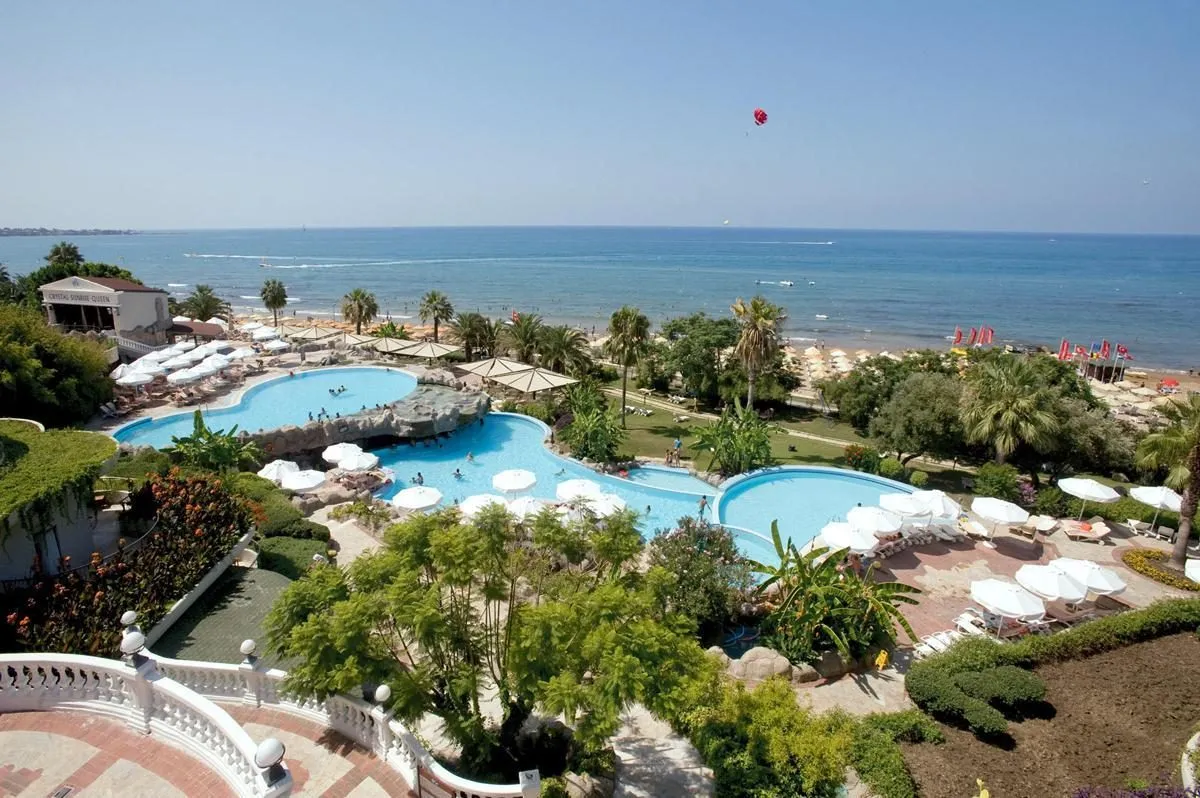 Descriere generală La doar câțiva pași de o plajă privată cu nisip se găsește hotelul Sunrise Queen Resort & Spa (ex. Crystal Sunrise Queen Luxury Resort Spa). Pe plajă sunt disponibile gratuit șezlonguri și umbrele de soare. Orașul Antalya este la aprox. 70 km. Hotelul dispune de serviciu de rentacar. Aeroportul (AYT) se află la aprox. 64 km. Un alt aeroport (GZP) este la cca. 108 km. Facilități Resortul dispune de 5 etaje și peste 514 camere repartizate între o clădire principală și de 5 clădiri secundare. Acesta oferă oaspeților săi recepție deschisă 24h (check-in de la 14:00, check out până la 12:00), lobby cu bar, aer condiționat, magazin, cinematograf, discotecă, parcare (gratuită) și birou de schimb valutar. Accesul la internet WiFi este disponibil gratuit pentru oaspeții hotelului. Pentru evenimente de afaceri, hotelul oferă o zonă de conferințe cu acces la internet. Serviciul de menaj este gratuit. Room service, spălătorie și serviciul medical sunt disponibile la un cost suplimentar. Piscină În grădinile acestui hotelul există o piscină precum și o piscină pentru copii și un tobogan de apă. La piscină sunt disponibile gratuit șezlonguri și umbrele de soare. La barul de la piscină sunt disponibile băuturi răcoritoare. Catering Mic dejun (între orele 07:00 - 10:00) bufet suedez. All Inclusive: micul dejun, prânzul și cina. Micul dejun, prânzul și cina pot fi servite numai în anumite restaurante. Apă, băuturi răcoritoare, cafea și ceai, bere, vin și băuturi alcoolice naționale. Băutură de bun venit, mic dejun târziu (între orele 10:00 - 11:00), prăjituri și produse de patiserie (11:00 - 17:00), aperitive (12:30 - 16:00), anumite băuturi alcoolice importate (între orele 01:00 - 10:00, limitate în anumite restaurante sau baruri), gustări la miezul nopții (22:30 - 23:45), internet gratuit, minibar gratuit în cameră (limitat) și utilizarea gratuită a seifului (în baza unei garanții). Sport/Leisure Este disponibil: Tenis de masă (gratuit), fitness, volei pe plajă, darts (gratuit), tenis (gratuit) și aerobic. Pe plajă puteți practica sporturi nautice precum jet ski și schi nautic (unele de către furnizori locali). Oferte de wellness: Saună, baie turcească și hamam gratuite. Zonă de spa și masaje contra cost. Divertisment pentru adulți: spectacole de seară și muzică live. Loc de joacă pentru copii. Îngrijirea copiilor: mini club pentru copii (de la 4 - 12 ani). Informații suplimentare Pentru anumite facilități sau activități se pot aplica taxe suplimentare. Unele servicii depind de anotimp și de condițiile climatice locale. Limbi de serviciu: engleză, germană și turcă. Carduri de credit: Visa și Euro/MasterCard. Standard Familienzimmer: Dotate cu pat pentru bebeluși (gratuit), parchet laminat, încălzire controlată centralizat, ceainic (gratuit), minibar (posibil contra cost), acces la internet (gratuit), seif (gratuit), TV prin satelit și canale locale precum și aer condiționat controlat central. Zimmer (SwimUp-Pool Terrasse): Cameră cu pat pentru bebeluși (gratuit), parchet laminat, încălzire controlată centralizat, ceainic (gratuit), minibar (posibil contra cost), acces la internet (gratuit), seif (gratuit), TV prin satelit și canale locale precum și aer condiționat controlat central. Queen Zimmer: Dotate cu pat pentru bebeluși (gratuit), parchet laminat, încălzire controlată centralizat, ceainic (gratuit), minibar (posibil contra cost), acces la internet (gratuit), seif (gratuit), TV prin satelit și canale locale precum și aer condiționat controlat central. Deluxe Zimmer (Meerblick, Terrasse): Dotate cu pat pentru bebeluși (gratuit), parchet laminat, încălzire controlată centralizat, ceainic (gratuit), minibar (posibil contra cost), balcon sau terasă, acces la internet (gratuit), seif (gratuit), TV prin satelit și canale locale precum și aer condiționat controlat central. Baie cu cadă. Doppel Standard Zimmer: Dotate cu pat pentru bebeluși (gratuit), parchet laminat, încălzire controlată centralizat, ceainic (gratuit), minibar (posibil contra cost), balcon, acces la internet (gratuit), seif (gratuit), TV prin satelit și canale locale precum și aer condiționat controlat central. Baie cu duș. Doppel Standard Zimmer (Economy): Cameră cu pat pentru bebeluși (gratuit), parchet laminat, încălzire controlată centralizat, ceainic (gratuit), minibar (posibil contra cost), acces la internet (gratuit), seif (gratuit), TV prin satelit și canale locale precum și aer condiționat controlat central. Baie cu duș. Doppel Standard Zimmer (Seitlicher Meerblick): Cameră cu pat pentru bebeluși (gratuit), parchet laminat, încălzire controlată centralizat, ceainic (gratuit), minibar (posibil contra cost), balcon, acces la internet (gratuit), seif (gratuit), TV prin satelit și canale locale precum și aer condiționat controlat central. Baie cu duș. Einzelbelegung Standard Zimmer: Dotate cu pat pentru bebeluși (gratuit), parchet laminat, încălzire controlată centralizat, ceainic (gratuit), minibar (posibil contra cost), balcon, acces la internet (gratuit), seif (gratuit), TV prin satelit și canale locale precum și aer condiționat controlat central. Baie cu duș. Einzelbelegung Standard Zimmer (Economy): Dotate cu pat pentru bebeluși (gratuit), parchet laminat, încălzire controlată centralizat, ceainic (gratuit), minibar (posibil contra cost), acces la internet (gratuit), seif (gratuit), TV prin satelit și canale locale precum și aer condiționat controlat central. Baie cu duș. Einzelbelegung Standard Zimmer (Seitlicher Meerblick): Cameră cu pat pentru bebeluși (gratuit), parchet laminat, încălzire controlată centralizat, ceainic (gratuit), minibar (posibil contra cost), balcon, acces la internet (gratuit), seif (gratuit), TV prin satelit și canale locale precum și aer condiționat controlat central. Baie cu duș. Standard Su