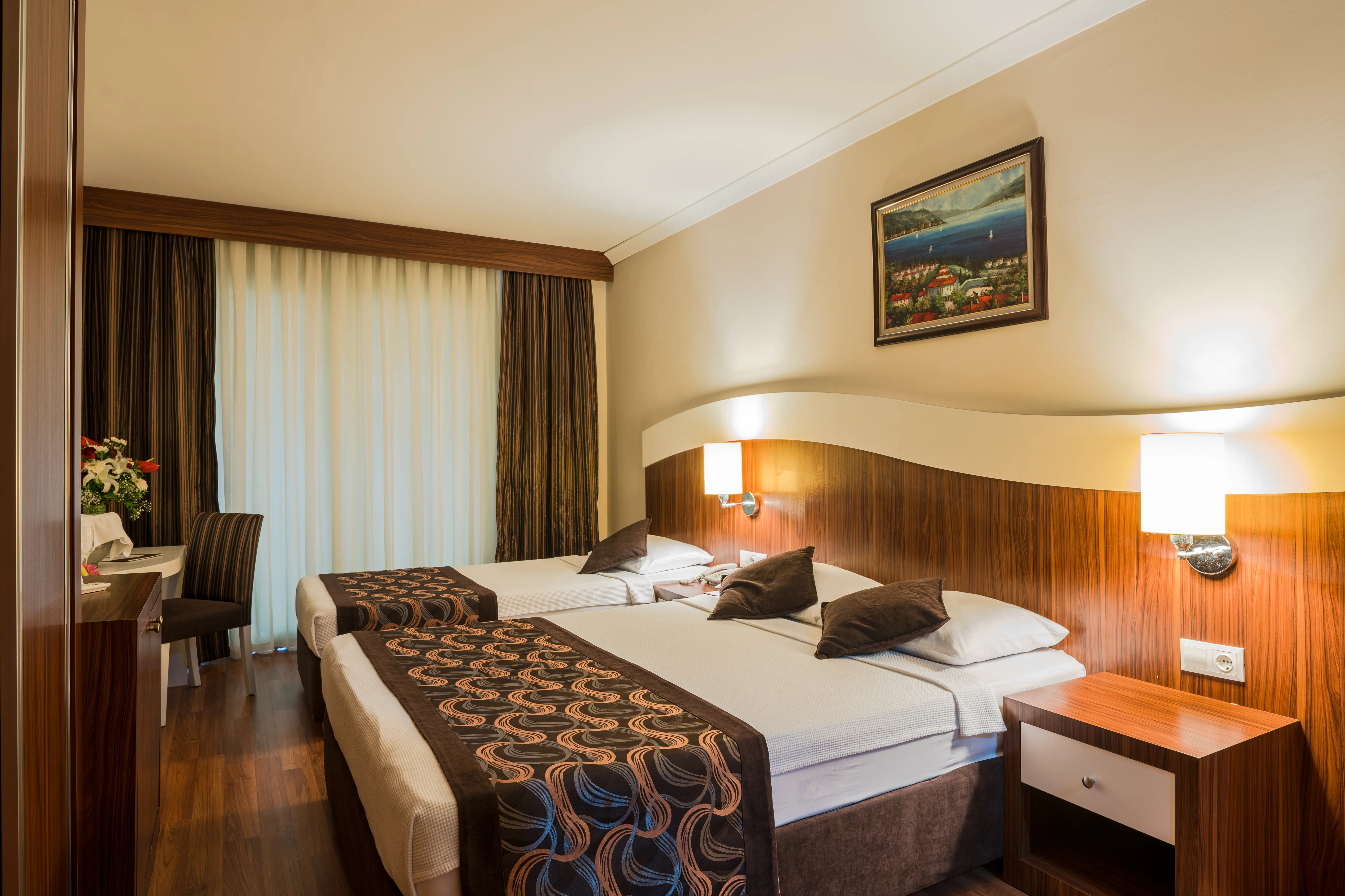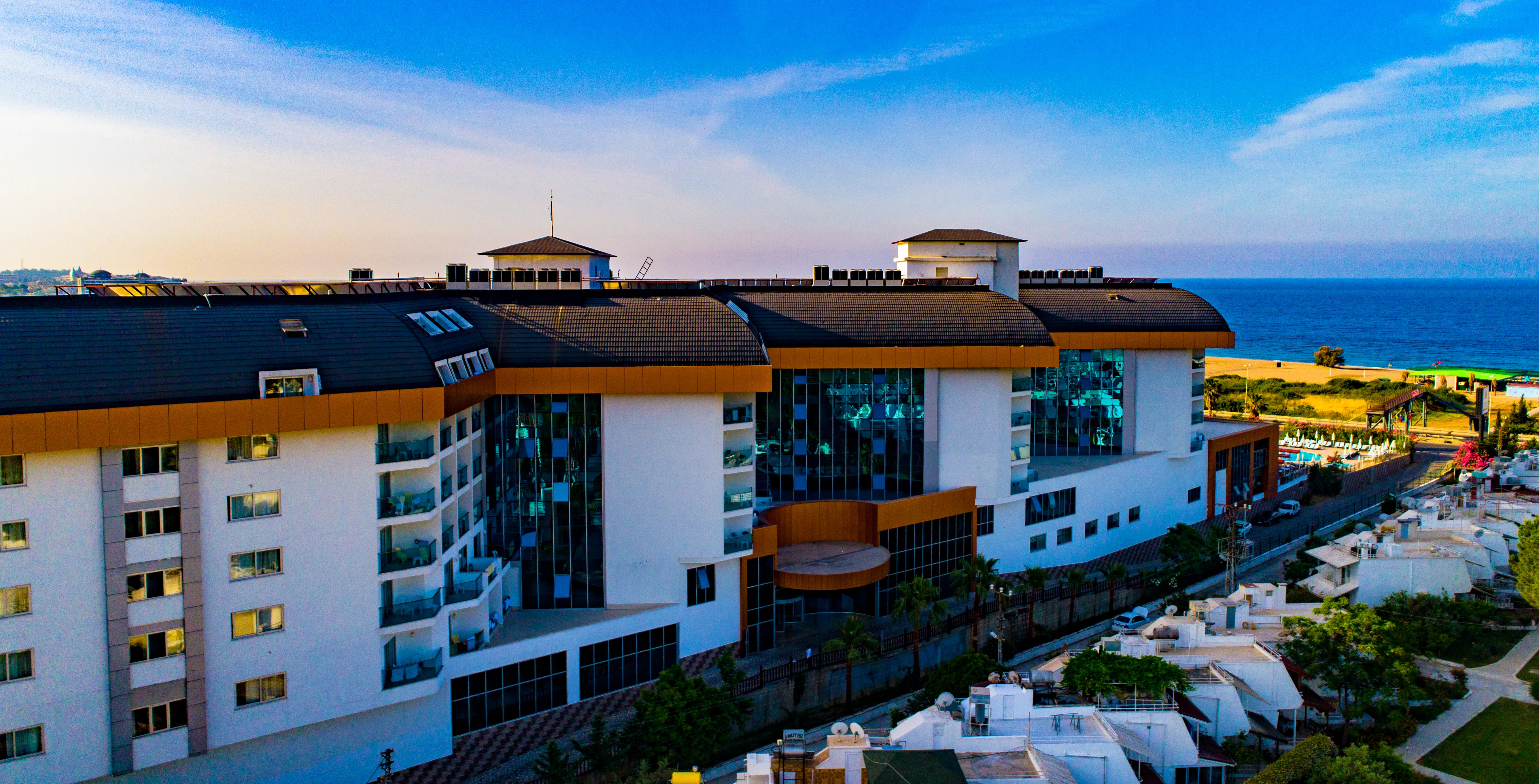 This modern resort welcomes its guests at just 300 metres from the lovely beach. Boasting both a large outdoor pool and a smaller indoor one, it is the perfect place for that much needed vacation. Its guests can spend their days sunbathing and sipping refreshing drinks from the poolside bar, while a visit to the spa and wellness centre can add that little extra needed for a total relaxation. While at it they can treat themselves to a massage or tune-up their muscles with a fast workout in the gym. For dining they can enjoy an open buffet first thing in the morning and then have their pick between the Ottoman and Italian dishes served throughout the day in the onsite restaurant. The surrounding area offers plenty of opportunities for jet-skiing or parasailing, so even those who crave some adrenaline rush will be covered.